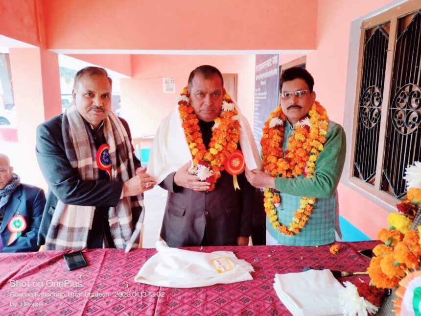 गोण्डा। उत्तर प्रदेश माध्यमिक शिक्षक संघ के नवनिर्वाचित जिलाध्यक्ष अजीत सिंह एवं मंत्री राधा मोहन पांडेय तथा उपाध्यक्ष डॉ एस नंदू व संरक्षक बृजेश द्विवेदी का शाखा इकाई विद्या नगर किसान इंटर कॉलेज मोतीगंज के द्वारा जोरदार स्वागत अभिनंदन किया गया। इस क्रम में शाखा इकाई के अध्यक्ष बाल्मीकि प्रसाद एवं मंत्री प्रिय शंकर मिश्र ने इकाई के शिक्षक साथियों के साथ जिला पदाधिकारियों को माला पहनाकर, बुके और शाल भेंटकर स्वागत किया।